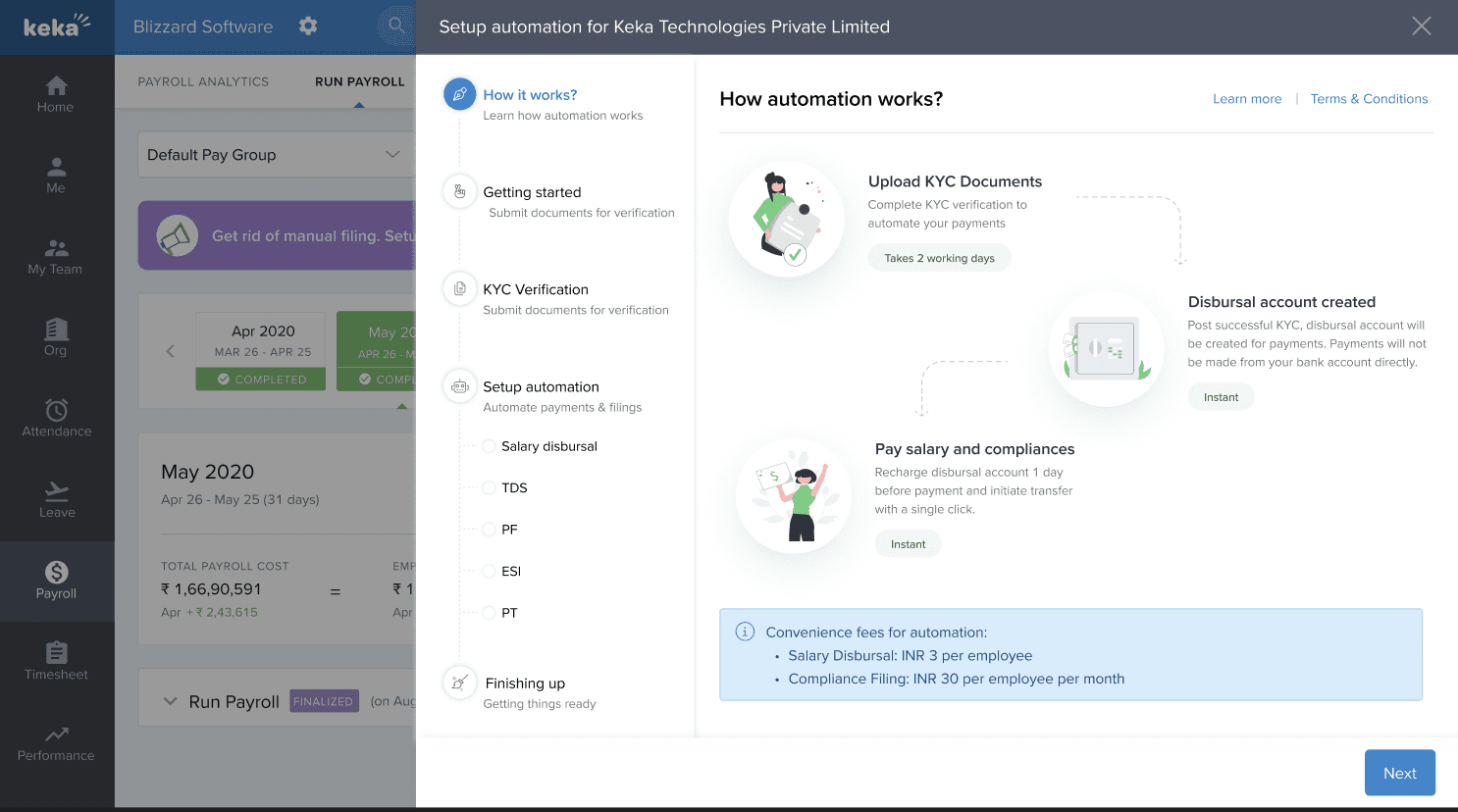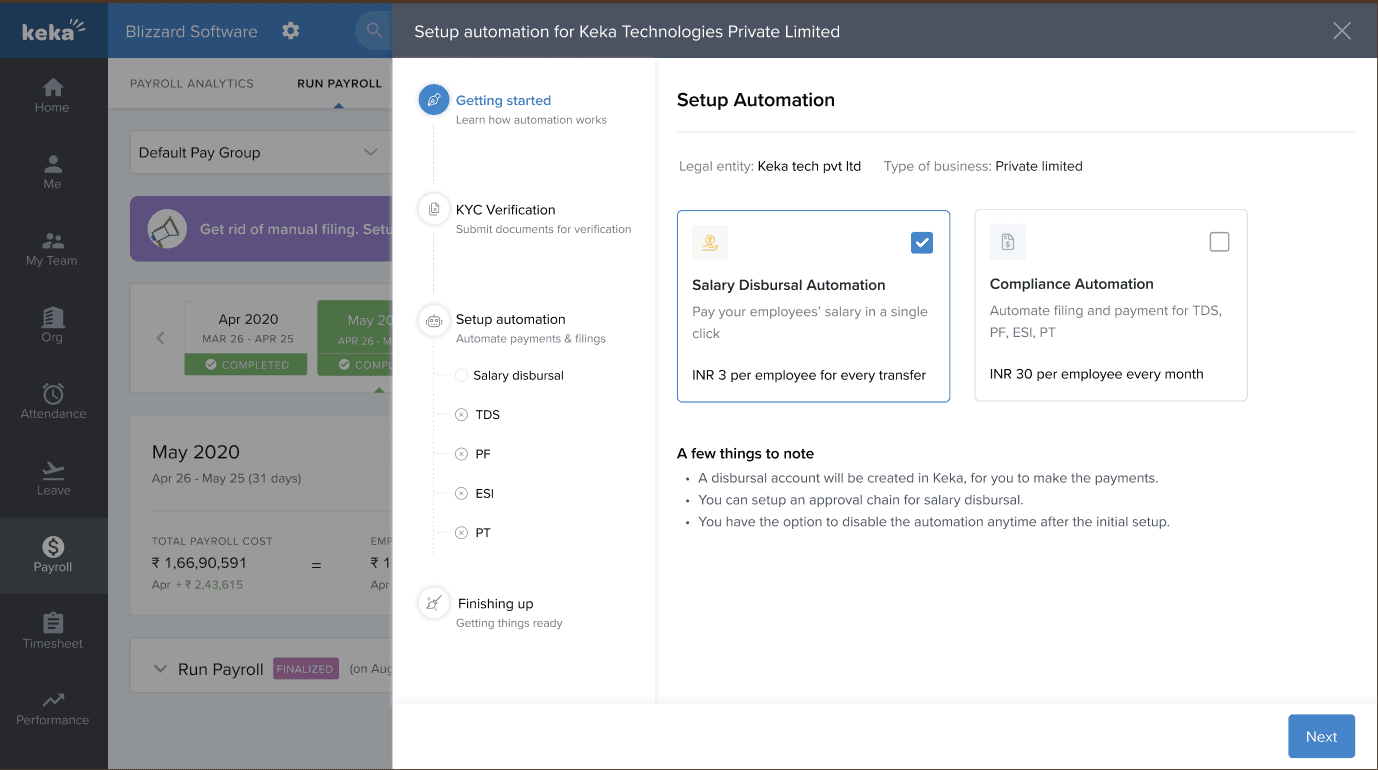 KYC verification is asked before Salary disbursal and Compliance automation steps and both these automations are combined under a section ‘Setup automation’.